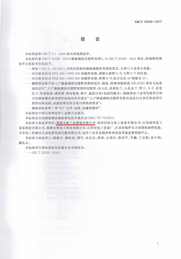 淄博太極以第一單位身份參與制定《搪玻璃閉式攪拌容器》、《搪玻璃開式攪拌容器》《搪玻璃設備技術條件》3個國家標準