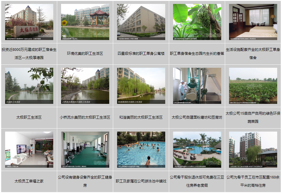 在2008年,太極公司投資近8000萬(wàn)元建成了職工公寓樓3座,戶外綠樹溪湖環(huán)繞,每戶面積170平米,統(tǒng)一配置60寸夏普電視等。所建成的職工單身公寓樓采用四星級(jí)標(biāo)準(zhǔn),共176間房,人均戶面積50平米,統(tǒng)一配置電視、網(wǎng)絡(luò)、洗浴間、床柜、空調(diào)、暖氣、桌椅等。而且單身公寓內(nèi)設(shè)有3000余平方米的生態(tài)園林和高檔游泳池,一年四季綠樹茂盛常春。